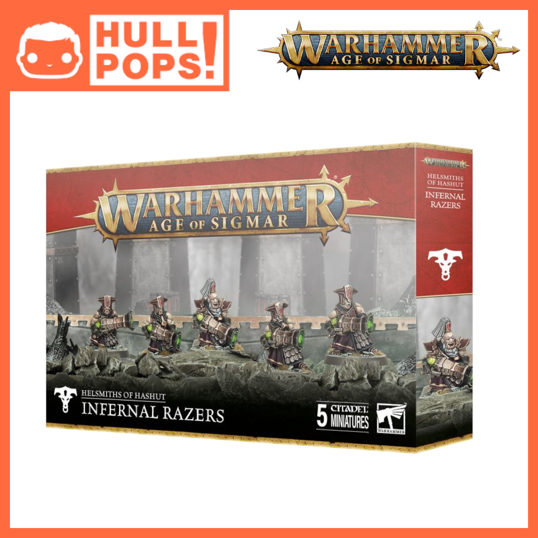 This multipart plastic kit builds five Infernal Razers, infantry wielding heavy firepower for your Helsmiths of Hashut armies in games of Warhammer Age of Sigmar. Heavily armoured and equipped with devastating Grizmalok blunderbusses or light infantry-roasting Karagthrun flamehurlers, they are ready to protect vital objectives and deal death from afar. The kit also includes parts to build an optional champion for your unit of death-dealing warriors.