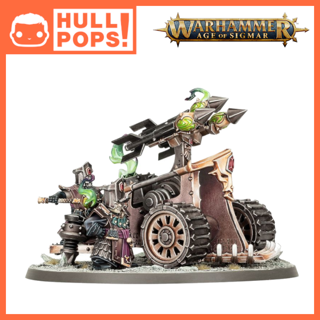 This multipart plastic kit builds a Deathshrieker Rocket Battery, a terrifying siege engine for your Helsmiths of Hashut armies in games Warhammer Age of Sigmar. Ingeniously designed by the chaos-touched duardin, these rockets fuse daemonic energies with potent warheads, capable of taking down even the largest targets. The kit includes two duardin and a hobgrot to crew your devastating war engine, which is adorned with Hashutite runes and the bull motif, making for an excellent painting project.